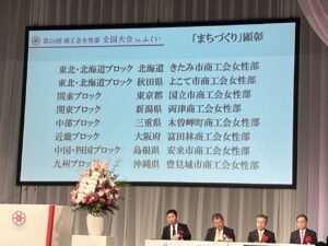 ※まちづくり顕彰→組織及び事業の推進が特に優秀であり、他の範となる女性部の功績を称え、エールを送るとともに、他の女性部を触発し意欲喚起を図ることを目的とし、商工会女性部全国大会で全女性連会長より顕彰が授与される。